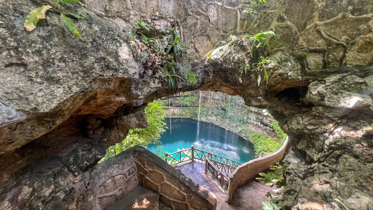 Dans le même domaine, vous découvrirez un cenote naturel spectaculaire, entouré de parois rocheuses et de végétation luxuriante. Ses eaux cristallines aux tons bleu turquoise offrent un décor féérique.