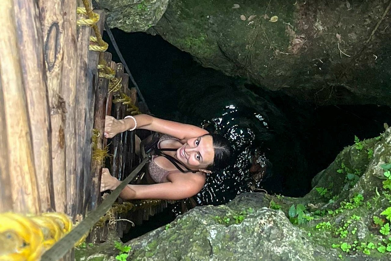 Nous vous proposons une immersion unique : descendre dans un cenote vertical de 12 mètres de profondeur à l’aide d’une corde et d’une échelle. Cette caverne silencieuse est éclairée par des lampes fournies par les gardiens du site.