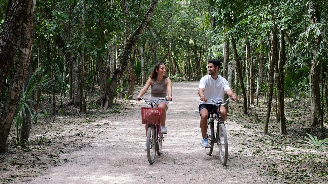 Après cette première partie à pied, nous poursuivons notre exploration à vélo, immergés dans l’atmosphère magique de la jungle, bercés par les chants d’oiseaux et les murmures de la nature. Pour ceux qui n’ont pas utilisé de vélo depuis longtemps ou qui ne se sentent pas à l’aise, il est également possible d’embarquer à bord d’un « taxi maya » : un tricycle local conduit par un habitant de la péninsule (sans supplément, inclus dans le service VivaOhlala).